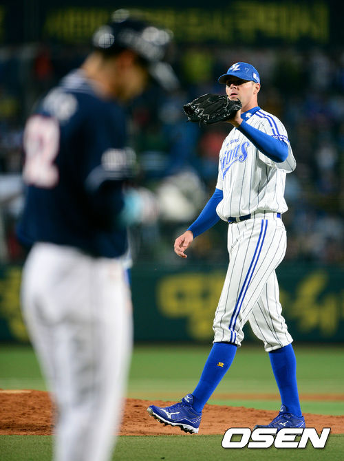 25일 오후 대구구장에서 열린 '2013 한국야쿠르트 세븐 프로야구' 한국시리즈 삼성 라이온즈와 두산 베어스의 2차전, 4회초 1사에서 삼성 밴덴헐크가 두산 김재호에 볼넷을 허용하고 있다.