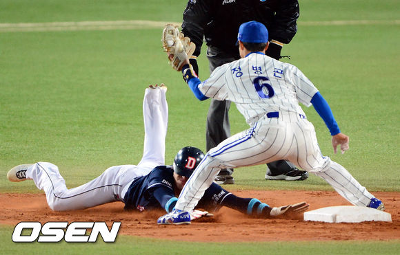 25일 오후 대구구장에서 열린 '2013 한국야쿠르트 세븐 프로야구' 한국시리즈 2차전 삼성 라이온즈와 두산 베어스의 경기 4회초 1사 1루 오재원 타석, 1루주자 김재호가 도루에 성공하고 있다.