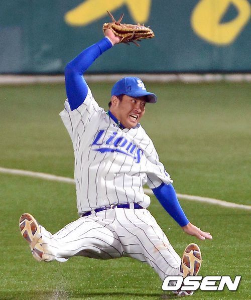 임재철의 빗맞은 타구 잡으며 엉덩방아 찧는 채태인