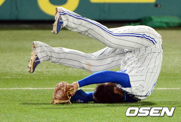 25일 오후 대구구장에서 열린 '2013 한국야쿠르트 세븐 프로야구' 한국시리즈 2차전 삼성 라이온즈와 두산 베어스의 경기 5회초 2사 임재철의 뜬공을 채태인이 잡고 있다.