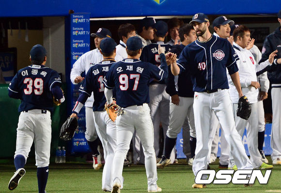 25일 오후 대구구장에서 열린 '2013 한국야쿠르트 세븐 프로야구' 한국시리즈 2차전 삼성 라이온즈와 두산 베어스의 경기 5회말을 마친 니퍼트가 덕아웃으로 돌아오는 수비들과 하이파이브를 하고 있다.