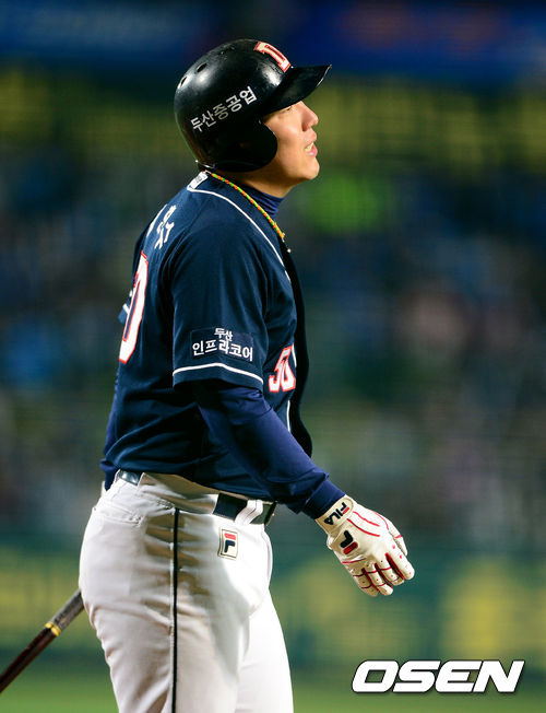 25일 오후 대구구장에서 열린 '2013 한국야쿠르트 세븐 프로야구' 한국시리즈 삼성 라이온즈와 두산 베어스의 2차전, 6회초 무사에서 두산 김현수가 삼진으로 물러나며 아쉬워하고 있다.
