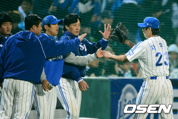 25일 오후 대구구장에서 열린 '2013 한국야쿠르트 세븐 프로야구' 한국시리즈 삼성 라이온즈와 두산 베어스의 2차전, 6회초 2사 1,2루에서 삼성 차우찬이 두산 오재원을 3루땅볼로 처리하고 더그아웃에서 동료선수들과 하이파이브를 하고 있다.