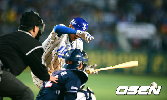 25일 오후 대구구장에서 열린 '2013 한국야쿠르트 세븐 프로야구' 한국시리즈 삼성 라이온즈와 두산 베어스의 2차전, 7회말 2사에서 삼성 정병곤이 두산 오현택의 투구에 맞고 있다.