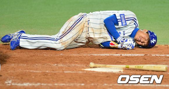 25일 오후 대구구장에서 열린 '2013 한국야쿠르트 세븐 프로야구' 한국시리즈 2차전 삼성 라이온즈와 두산 베어스의 경기, 7회말 삼성 공격 2사 주자없는 상황 정병곤이 두산 투수 오현택의 공에 몸을 맞은 뒤 넘어지며 괴로워하고 있다.
