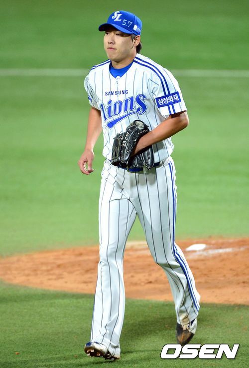 25일 오후 대구구장에서 열리는 '2013 한국야쿠르트 세븐 프로야구' 한국시리즈 2차전 삼성 라이온즈와 두산 베어스의 경기 8회초 1사 김현수에 안타를 맞은 차우찬이 마운드를 내려가고 있다.