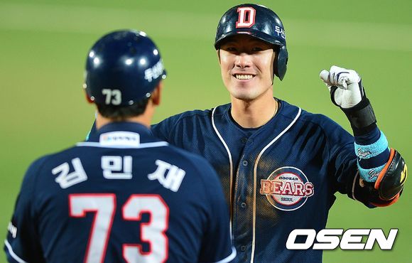 25일 오후 대구구장에서 열린 '2013 한국야쿠르트 세븐 프로야구' 한국시리즈 2차전 삼성 라이온즈와 두산 베어스의 경기, 8회초 두산 공격 2사 1, 3루 상황 김재호가 선제 1타점 좌전안타를 날리고 환호하고 있다.