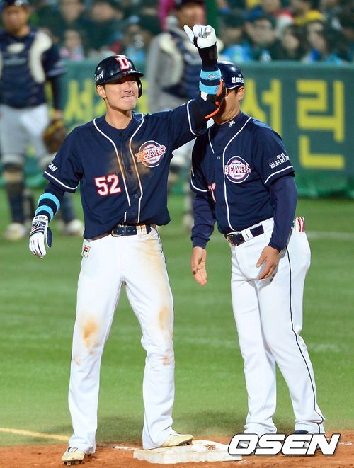 25일 오후 대구구장에서 열리는 '2013 한국야쿠르트 세븐 프로야구' 한국시리즈 2차전 삼성 라이온즈와 두산 베어스의 경기 8회초 2사 1,3루 김재호가 적시타를 치고 환호하고 있다.