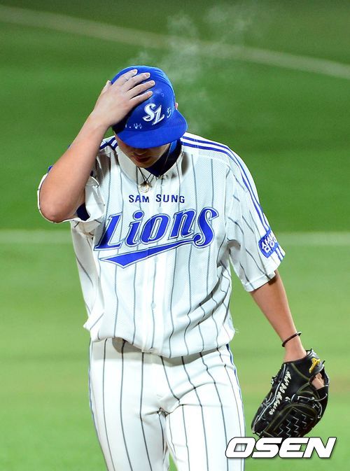 25일 오후 대구구장에서 열리는 '2013 한국야쿠르트 세븐 프로야구' 한국시리즈 2차전 삼성 라이온즈와 두산 베어스의 경기 8회초 2사 1,3루 김재호에게 적시타를 맞은 안지만이 머리를 치며 자책하고 있다.