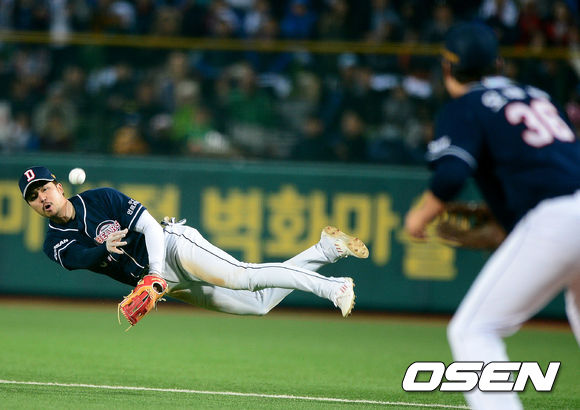 25일 오후 대구구장에서 열린 '2013 한국야쿠르트 세븐 프로야구' 한국시리즈 삼성 라이온즈와 두산 베어스의 2차전, 8회말 무사 1루에서 두산 오재원이 삼성 박석민의 2루 땅볼 타구를 어렵게 잡아 1루로 송구하고 있다. 하지만 박석민은 세이프.