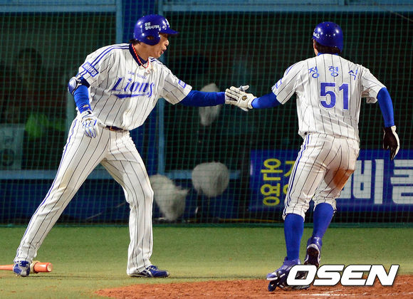 25일 오후 대구구장에서 열린 '2013 한국야쿠르트 세븐 프로야구' 한국시리즈 2차전 삼성 라이온즈와 두산 베어스의 경기 8회말 1사 1,2루 채태인의 1타점 적시타에 홈을 밟은 정형식이 이승엽과 하이파이브를 하고 있다.