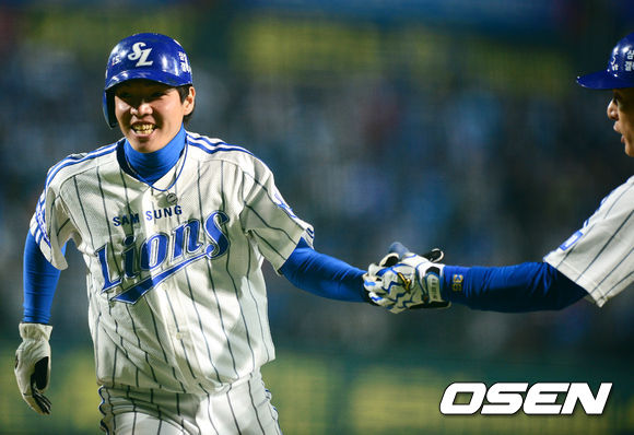 25일 오후 대구구장에서 열린 '2013 한국야쿠르트 세븐 프로야구' 한국시리즈 삼성 라이온즈와 두산 베어스의 2차전, 8회말 1사 1,2루에서 삼성 채태인의 동점 우전 적시타에 정형식이 홈을 밟고 기뻐하고 있다.