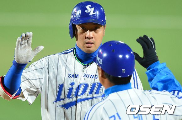 25일 오후 대구구장에서 열린 '2013 한국야쿠르트 세븐 프로야구' 한국시리즈 2차전 삼성 라이온즈와 두산 베어스의 경기, 8회말 삼성 공격 1사 1, 2루 상황 채태인이 동점 1타점 적시 우전안타를 날리고 김태균 코치와 인사를 나누고 있다.