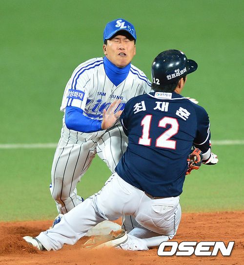 25일 오후 대구구장에서 열린 '2013 한국야쿠르트 세븐 프로야구' 한국시리즈 2차전 삼성 라이온즈와 두산 베어스의 경기, 9회초 두산 공격 무사 1루 상황 손시헌의 번트 때 2루로 향한 주자 최재훈이 포스아웃 되며 삼성 유격수 정현과 충돌하고 있다.