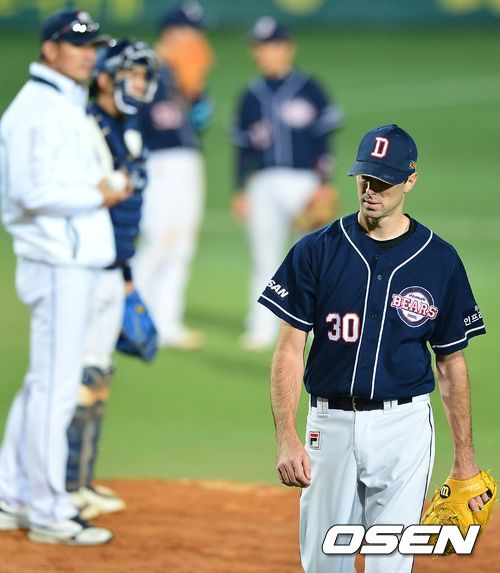 25일 오후 대구구장에서 열린 '2013 한국야쿠르트 세븐 프로야구' 한국시리즈 2차전 삼성 라이온즈와 두산 베어스의 경기, 연장 10회말 삼성 공격 1사 3루 상황 두산 투수 핸킨스가 마운드를 내려오고 있다.