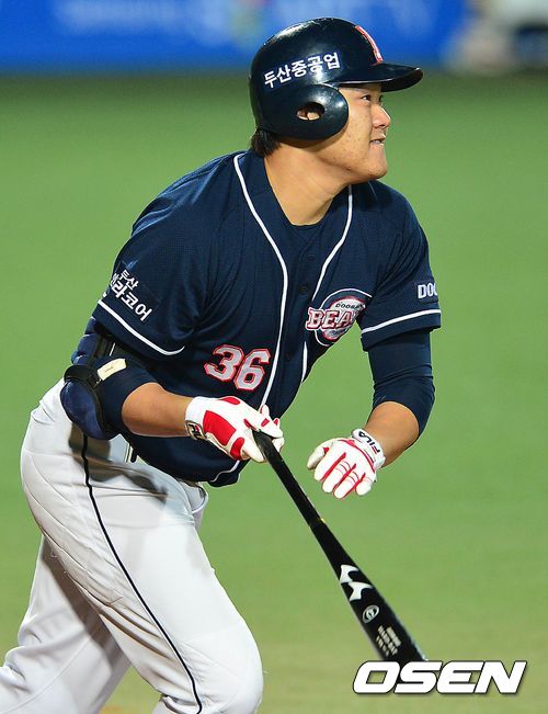 25일 오후 대구구장에서 열린 '2013 한국야쿠르트 세븐 프로야구' 한국시리즈 2차전 삼성 라이온즈와 두산 베어스의 경기, 연장 12회초 두산 공격 1사 주자없는 상황 오재일이 우월 솔로포를 날리고 타구를 바라보고 있다.