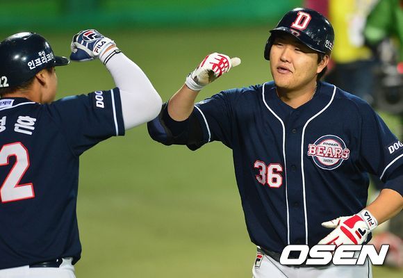 25일 오후 대구구장에서 열린 '2013 한국야쿠르트 세븐 프로야구' 한국시리즈 2차전 삼성 라이온즈와 두산 베어스의 경기, 연장 13회초 두산 공격 1사 주자없는 상황 오재일이 우월 솔로포를 터트리고 홍성흔과 인사를 나누고 있다.