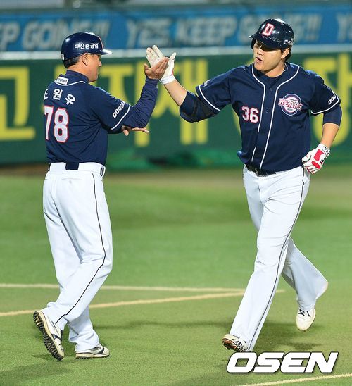 25일 오후 대구구장에서 열린 '2013 한국야쿠르트 세븐 프로야구' 한국시리즈 2차전 삼성 라이온즈와 두산 베어스의 경기, 연장 13회초 두산 공격 1사 주자없는 상황 오재일이 우월 솔로포를 터트리고 조원우 코치와 인사를 나누고 있다.