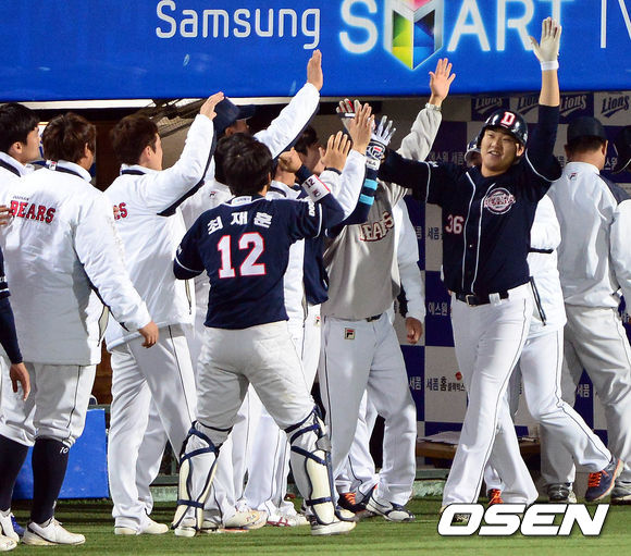 25일 오후 대구구장에서 열린 '2013 한국야쿠르트 세븐 프로야구' 한국시리즈 2차전 삼성 라이온즈와 두산 베어스의 경기 13회초 1사 오재일이 솔로포를 치고 동료들과 하이파이브를 하고 있다.
