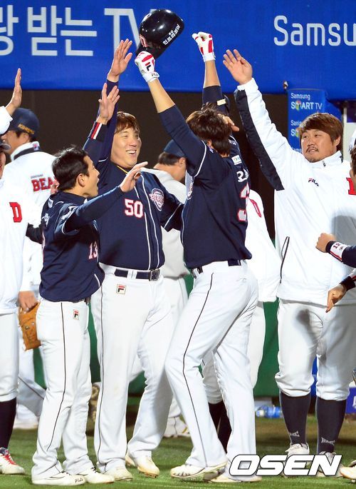 25일 오후 대구구장에서 열리는 '2013 한국야쿠르트 세븐 프로야구' 한국시리즈 2차전 삼성 라이온즈와 두산 베어스의 경기 13회초 1사 오재일이 오승환으로부터 홈런을 치고 동료들의 환영을 받고 있다.