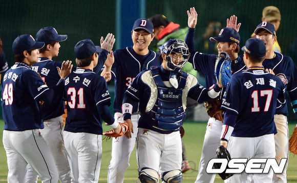 25일 오후 대구구장에서 열린 '2013 한국야쿠르트 세븐 프로야구' 한국시리즈 2차전 삼성 라이온즈와 두산 베어스의 경기 종료 후 두산 선수들이 승리를 기뻐하고 있다.