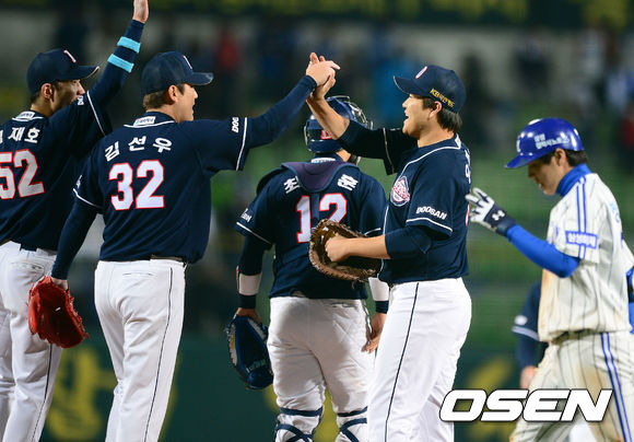 경기후 승리한 두산 선수들이 하이파이브를 하고 있다./jpnews@osen.co.kr