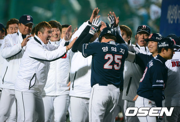 연장 13회초 1사 1,2루에서 두산 양의지가 오재원의 1타점 적시타에 홈을 밟고 동료선수들과 기뻐하고 있다./jpnews@osen.co.kr