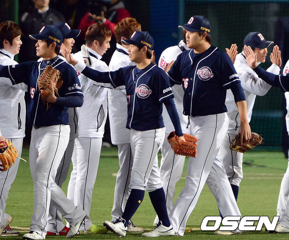 25일 오후 대구구장에서 열린 '2013 한국야쿠르트 세븐 프로야구' 한국시리즈 2차전 삼성 라이온즈와 두산 베어스의 경기 종료 후 오재일이 동료들과 하이파이브를 하고 있다.