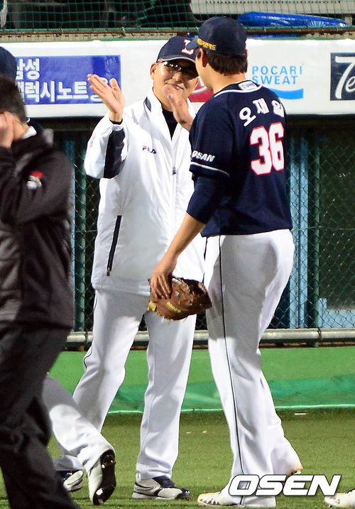 25일 오후 대구구장에서 열린 '2013 한국야쿠르트 세븐 프로야구' 한국시리즈 2차전 삼성 라이온즈와 두산 베어스의 경기 종료 후 김진욱 감독이 오재일과 하이파이브를 하고 있다.