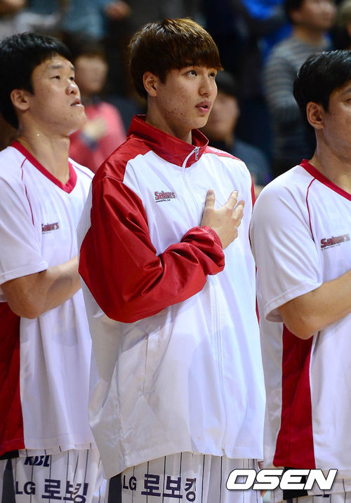 경기에 앞서 LG 김종규가 국민의례를 하고 있다.