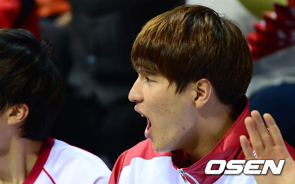 1쿼터 LG 김종규가 벤치에서 팀득점에 환호하고 있다.
