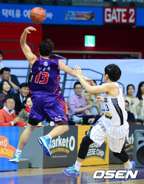 3쿼터 오리온스 김동욱이 라인 밖으로 나가는 공을 살려내고 있다.