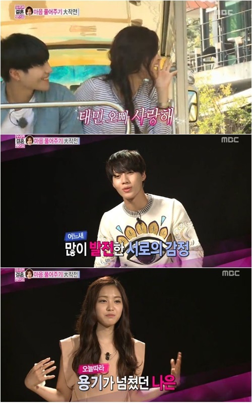태민과 나은은 26일 방송된 MBC 예능프로그램 '우리 결혼했어요'에서 실 풀이를 하며 오해를 풀고 서로간의 사이를 한층 좁혀갔다.