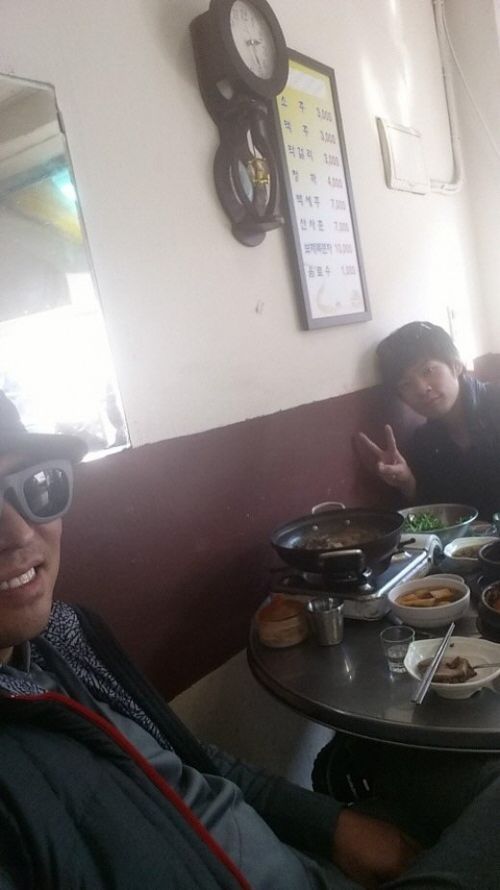 사진 속에는 수육을 안주로 두 사람이 마주한 채 낮술을 즐기는 모습이 담겼다. 특히 카메라를 향해 빼꼼히 얼굴을 내민 장기하가 눈에 띈다.