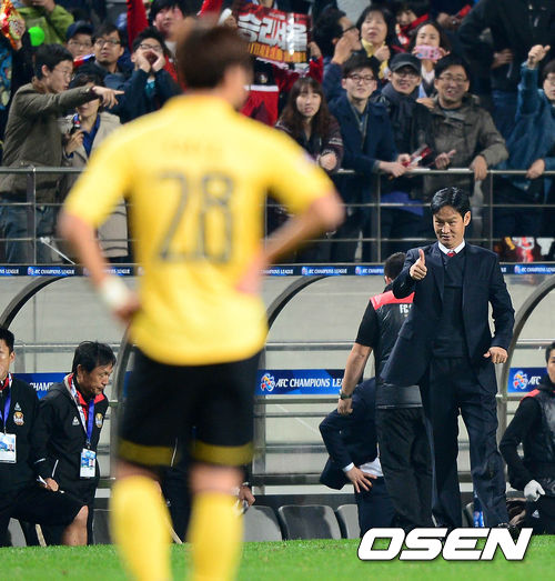 26일 서울월드컵경기장에서 열린 2013 아시아축구연맹(AFC) 챔피언스리그 결승 1차전 FC 서울과 광저우 에버그란데FC의 경기, 전반 서울 에스쿠데로가 선제골을 성공시키자 최용수 감독이 엄지를 들어 올리고 있다.