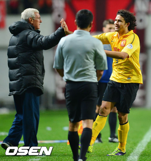26일 서울월드컵경기장에서 열린 2013 아시아축구연맹(AFC) 챔피언스리그 결승 1차전 FC 서울과 광저우 에버그란데FC의 경기, 전반 광저우 엘케슨이 동점골을 성공시킨 후 기뻐하고 있다.