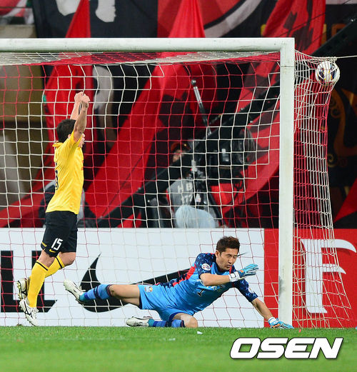 26일 서울월드컵경기장에서 열린 2013 아시아축구연맹(AFC) 챔피언스리그 결승 1차전 FC 서울과 광저우 에버그란데FC의 경기, 전반 서울 김용대가 광저우 엘케슨에 동점골을 허용하고 있다.