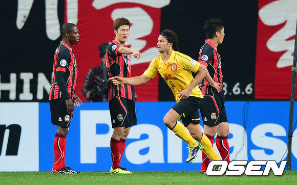 26일 서울월드컵경기장에서 열린 2013 아시아축구연맹(AFC) 챔피언스리그 결승 1차전 FC 서울과 광저우 에버그란데FC의 경기, 전반 광저우 엘케슨이 동점골을 성공시키고 환호하고 있다.