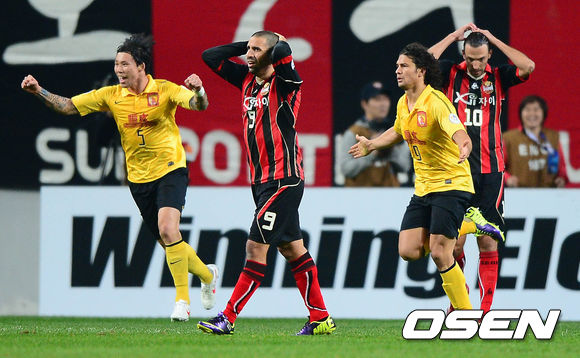 26일 서울월드컵경기장에서 열린 2013 아시아축구연맹(AFC) 챔피언스리그 결승 1차전 FC 서울과 광저우 에버그란데FC의 경기, 전반 광저우 엘케슨이 동점골을 성공시키고 환호하고 있다.