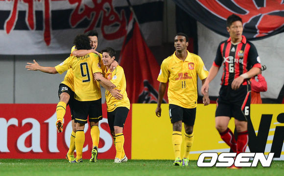 26일 서울월드컵경기장에서 열린 2013 아시아축구연맹(AFC) 챔피언스리그 결승 1차전 FC 서울과 광저우 에버그란데FC의 경기, 후반 광저우 가오린이 역전골을 성공시키고 환호하고 있다.