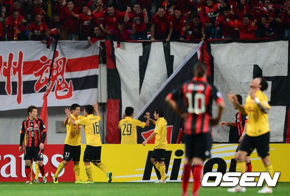 26일 서울월드컵경기장에서 열린 2013 아시아축구연맹(AFC) 챔피언스리그 결승 1차전 FC 서울과 광저우 에버그란데FC의 경기, 후반 광저우 가오린이 역전골을 성공시키고 환호하고 있다.