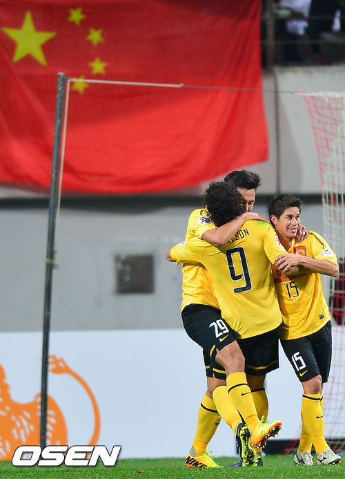 26일 서울월드컵경기장에서 열린 2013 아시아축구연맹(AFC) 챔피언스리그 결승 1차전 FC 서울과 광저우 에버그란데FC의 경기, 후반 광저우 가오린이 역전골에 성공한 후 기뻐하고 있다.