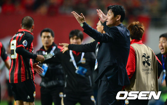 26일 서울월드컵경기장에서 열린 2013 아시아축구연맹(AFC) 챔피언스리그 결승 1차전 FC 서울과 광저우 에버그란데FC의 경기, 후반 서울 데얀의 동점골에 최용수 감독이 환호하고 있다.