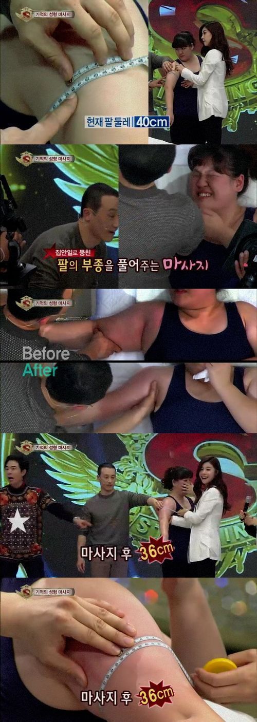 기적의 10분 마사지가 끝난 후 방청객의 팔뚝 치수를 쟀고 방청객은 눈물을 보일 정도로 만족스러워 했다. 단 10분의 마사지 후 팔뚝 치수는 4cm가 줄어 36cm가 됐고 출연진 모두 놀라움을 감추지 못했다.