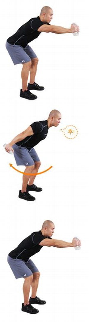다리를 어깨 너비로 벌린 후 무릎을 살짝 구부린 뒤, 페트병을 잡은 팔을 앞으로 나란히 한 상태에서 상체를 숙인다음, 하체를 움직이지 않고 두 팔을 뒤로 뻗어준다.