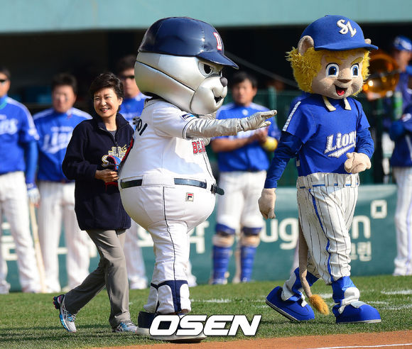 27일 오후 서울 잠실구장에서 열리는 '2013 한국야쿠르트 세븐 프로야구' 한국시리즈 3차전 두산 베어스와 삼성 라이온즈의 경기에 앞서 박근혜 대통령이 승리기원 시구에 앞서 마운드에 오르고 있다.