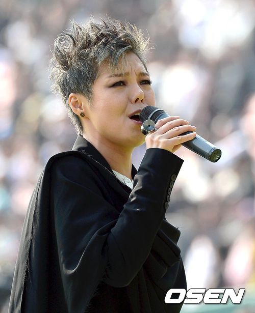 27일 오후 서울 잠실구장에서 열리는 '2013 한국야쿠르트 세븐 프로야구' 한국시리즈 3차전 두산 베어스와 삼성 라이온즈의 경기 이은미가 애국가를 부르고 있다.