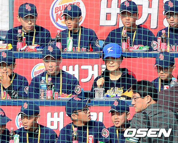 27일 오후 서울 잠실구장에서 열린 '2013 한국야쿠르트 세븐 프로야구' 한국시리즈 3차전 두산 베어스와 삼성 라이온즈의 경기, 박근혜 대통령이 관중석에서 경기를 지켜보고 있다.