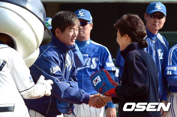 27일 오후 서울 잠실구장에서 열리는 '2013 한국야쿠르트 세븐 프로야구' 한국시리즈 3차전 두산 베어스와 삼성 라이온즈의 경기 박근혜 대통령이 시구를 한 후 류중일 감독과 인사를 나누고 있다.