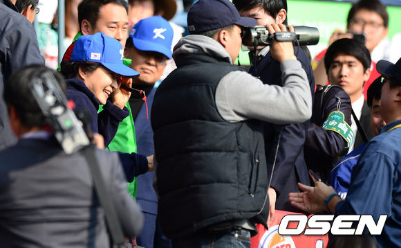 27일 오후 서울 잠실구장에서 열린 '2013 한국야쿠르트 세븐 프로야구' 한국시리즈 3차전 두산 베어스와 삼성 라이온즈의 경기, 시구자로 나선 박근혜 대통령이 경기를 관전하고 야구팬과 인사를 나누고 있다.